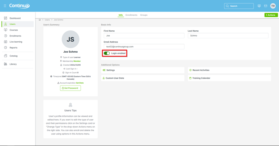 To enable a user account again, repeat the process for disabling the account, setting the account to Login enabled.