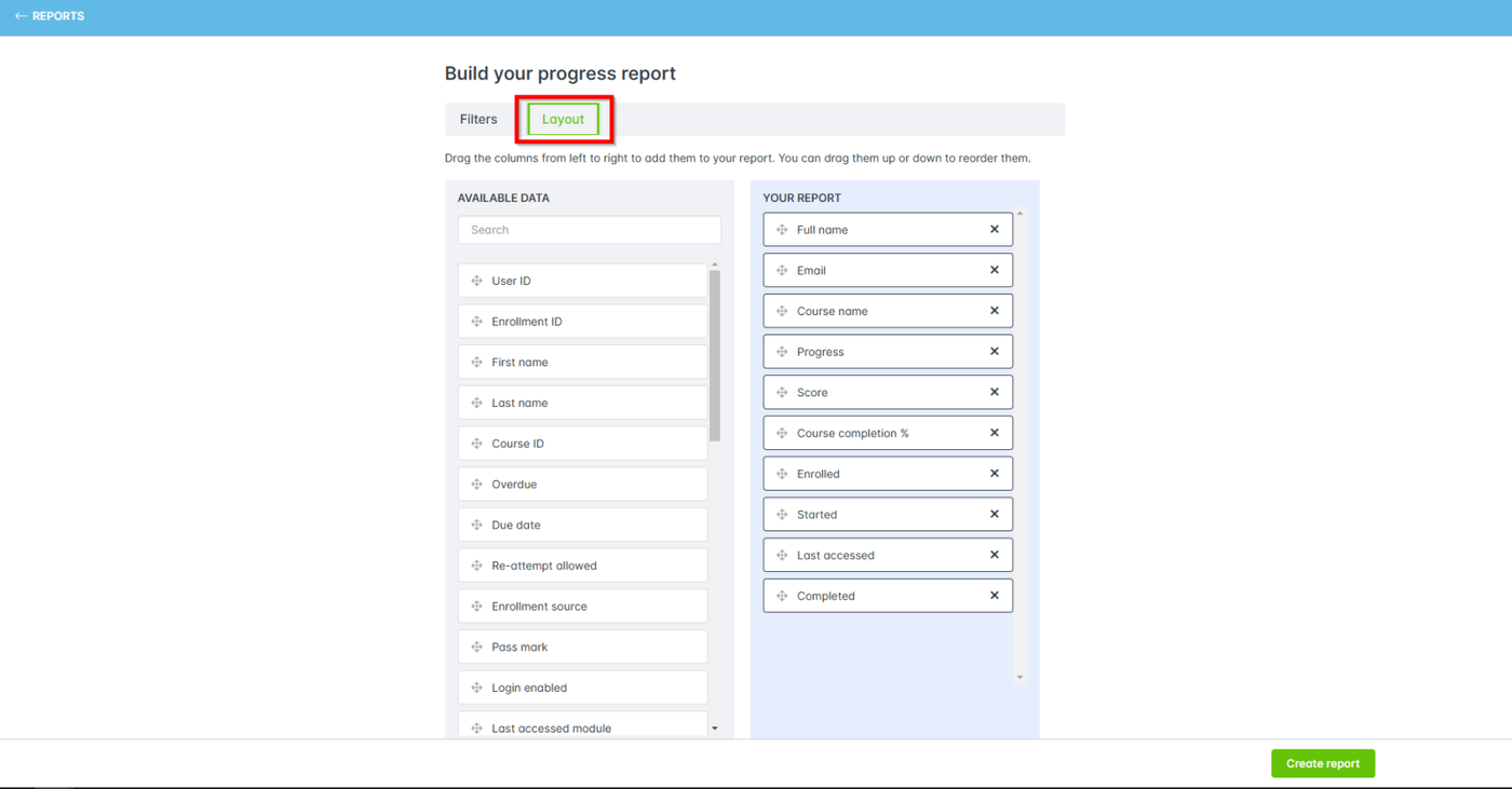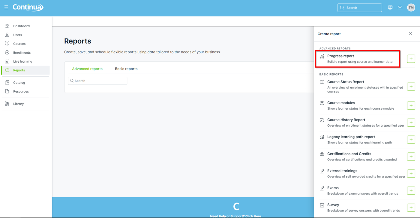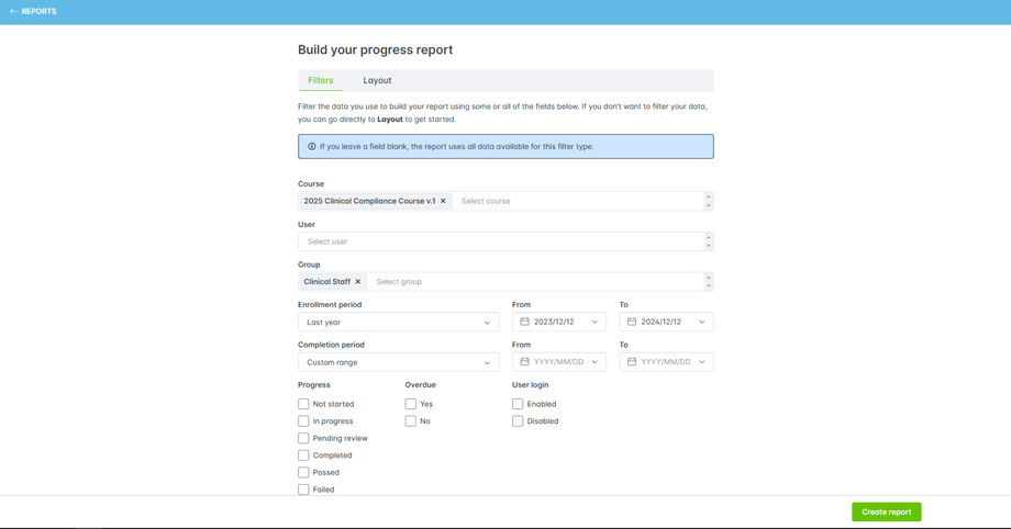 Note: For a Progress report, you can select up to 100 courses for the report, or leave the field empty to report on all courses.